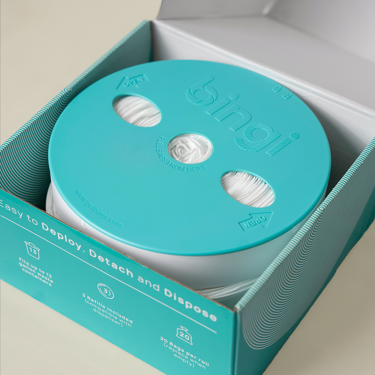 The Bingi dispenser design isn’t just sleek—it’s engineered for efficiency. Compact and refillable, the disc fits right at the bottom of your bin, delivering trash bags exactly where you need them.